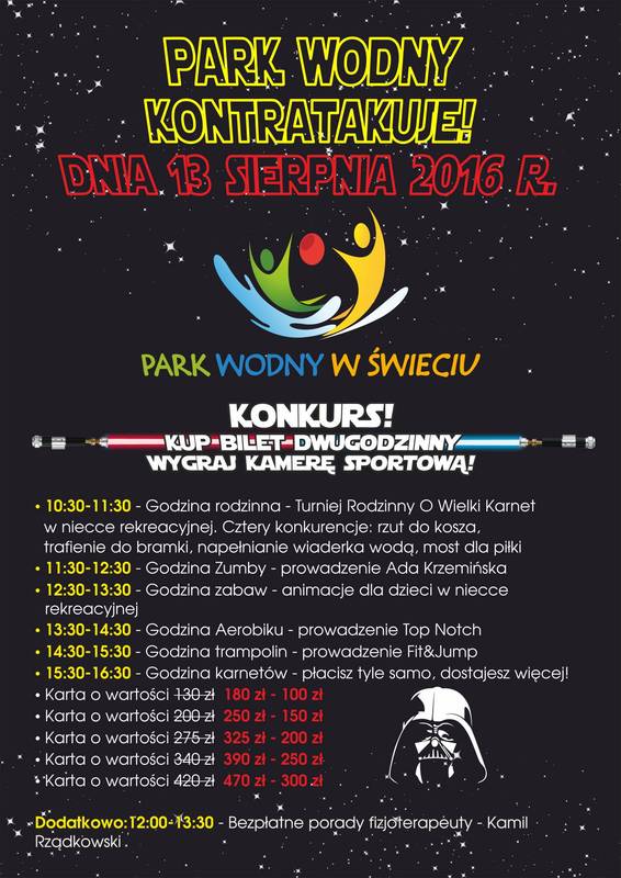 - Wracamy 13 sierpnia. Dla naszych gości przygotowaliśmy szereg promocji i atrakcji – zapowiada Ariel Stawski, kierownik Parku Wodnego w Świeciu. - Na początek zaprosimy na turniej rodzinny o wielki karnet. Trzyosobowe drużyny powalczą ze sobą w czterech konkurencjach. Nie zabraknie też zajęć pokazowych: zaprosimy na zumbę, aqua aerobik i trampoliny. Trampoliny są nowością w świeckim Aquaparku i jak zapewnia kierownik, wpiszą się w stałą ofertę obiektu.