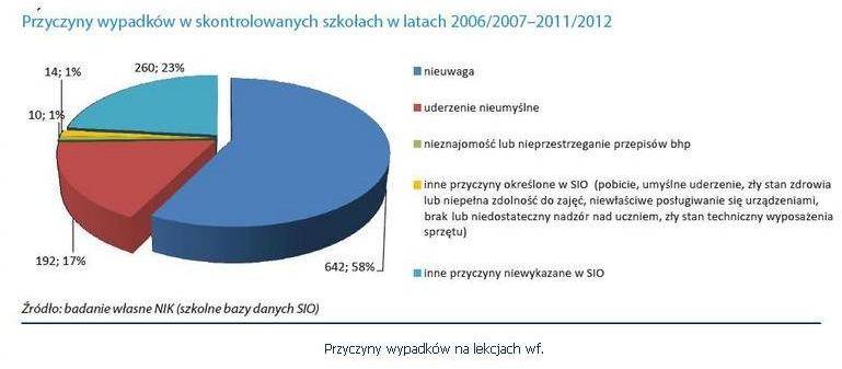 W ponad połowie szkół nie podejmowano wystarczających działań służących zapewnieniu uczniom bezpiecznych warunków podczas zajęć wychowania fizycznego. Stwierdzone nieprawidłowości polegały na użytkowaniu obiektów i urządzeń sportowych znajdujących się w wadliwym stanie technicznym oraz nieposiadających odpowiednich atestów i certyfikatów.