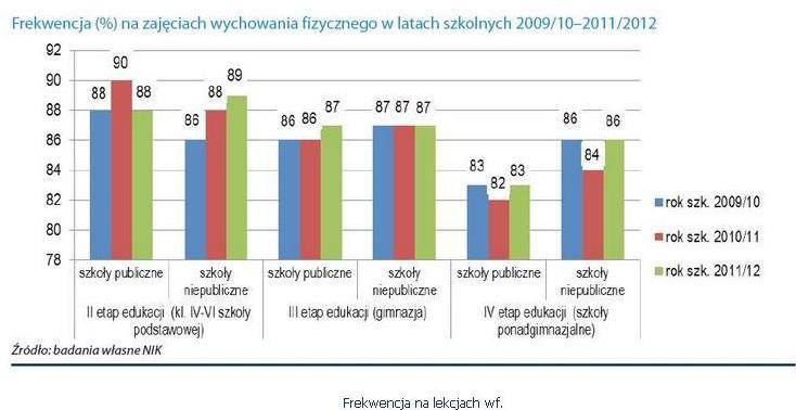 Według badań NIK na kolejnych etapach edukacji zmniejsza się aktywny udział dzieci i młodzieży w zajęciach wychowania fizycznego. Przeciętna liczba uczniów zwolnionych z uczestnictwa w tych zajęciach przez dyrektora szkoły (na podstawie opinii lekarza) kształtowała się na poziomie 2 proc. w klasach IV-VI szkoły podstawowej, 5 proc. w gimnazjach, a w szkołach ponadgimnazjalnych wyniosła 12 proc.