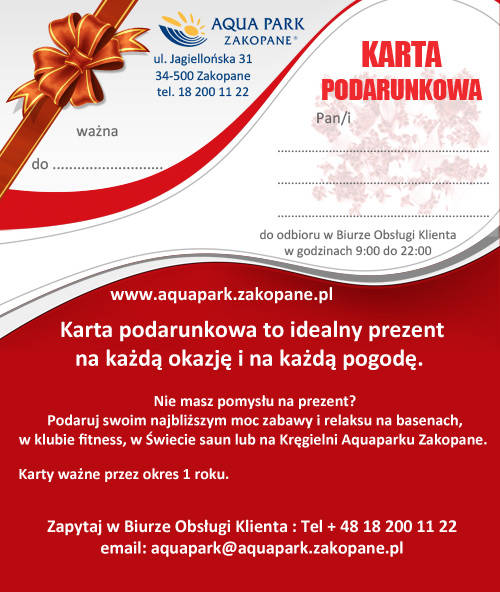 Upominkowe karnety oferują m.in. wągrowiecki Aquapark oraz Aquapark w Zakopanem.