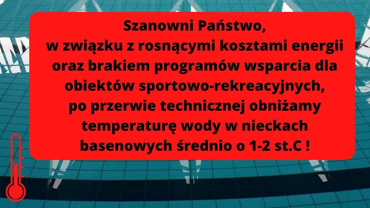 – Szanowni Państwo, w związku z rosnącymi kosztami energii oraz brakiem programów wsparcia dla obiektów sportowo-rekreacyjnych, po przerwie technicznej obniżamy temperaturę wody w nieckach basenowych średnio o 1-2 st. C – czytamy na stronie Pływalni.
