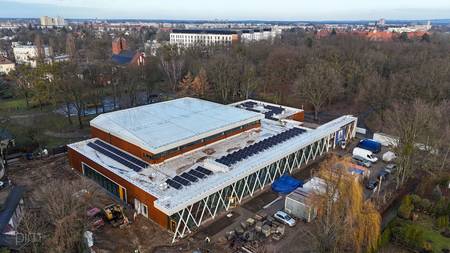 Prace przy budowie nowej Pływalni Grunwald przy ul. Taborowej zbliżają się do końca. Obiekt znajduje się obecnie w fazie robót wykończeniowych, a z tygodnia na tydzień coraz lepiej widać kształt nowoczesnej przestrzeni przeznaczonej do sportu, rekreacji i rehabilitacji dla mieszkanek i mieszkańców Poznania.