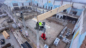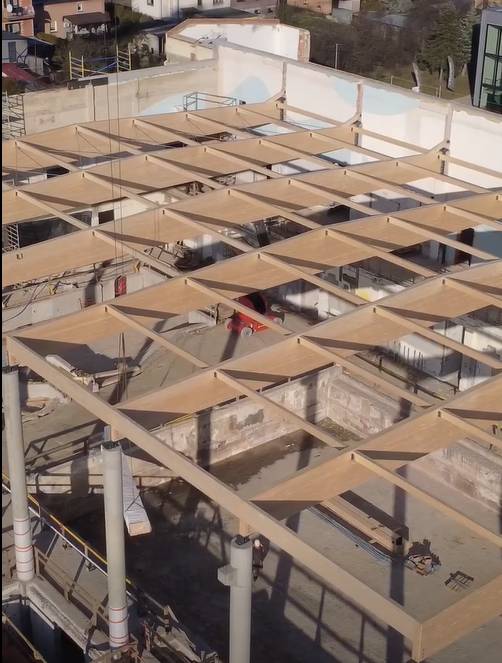 Aktualnie na placu budowy pływalni Akwawit w Lesznie trwa montaż dachu. W miejsce zdemontowanej stalowej konstrukcji realizowane jest nowoczesne zadaszenie wykonane w technologii drewna klejonego. Konstrukcja będzie oparta na już zamontowanych dźwigarach o długości 26,67 m, wysokości sięgającej 176 cm oraz masie około 3,4 t każdy.
