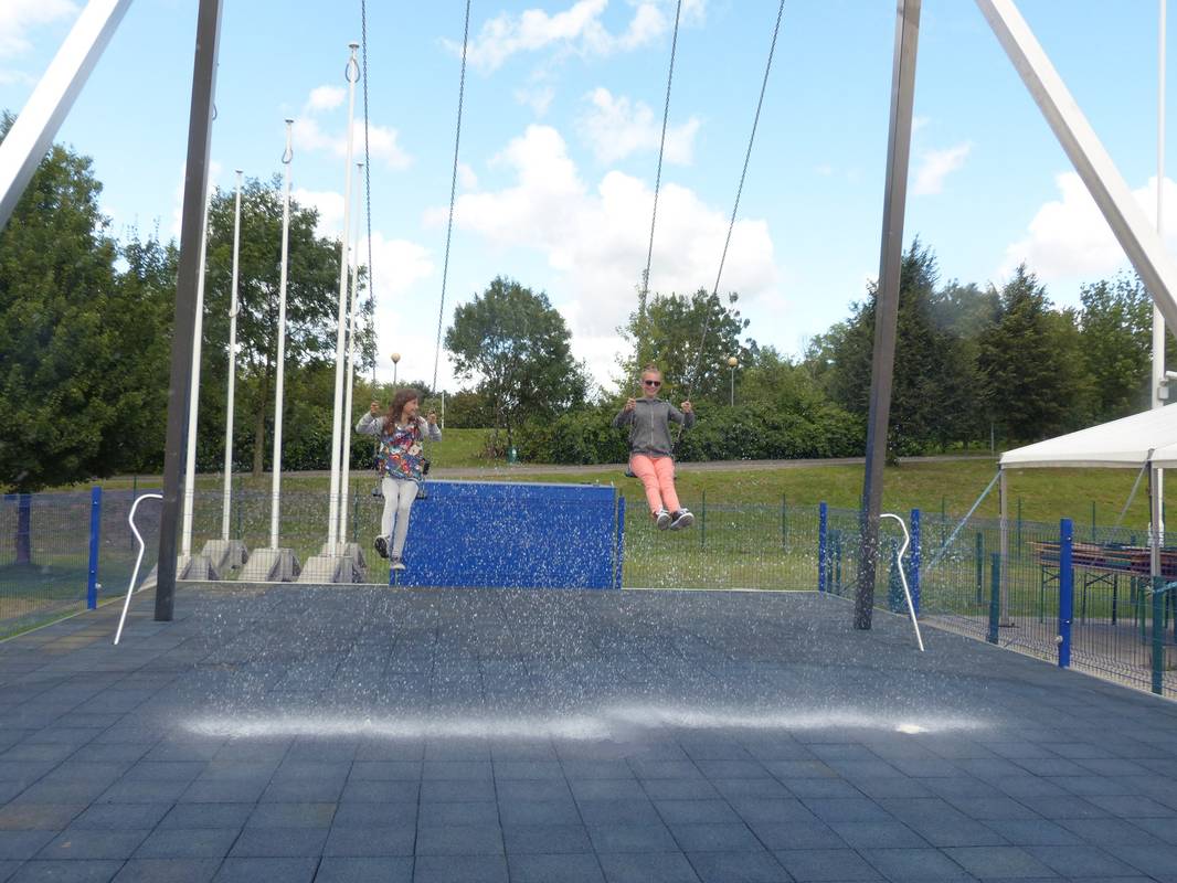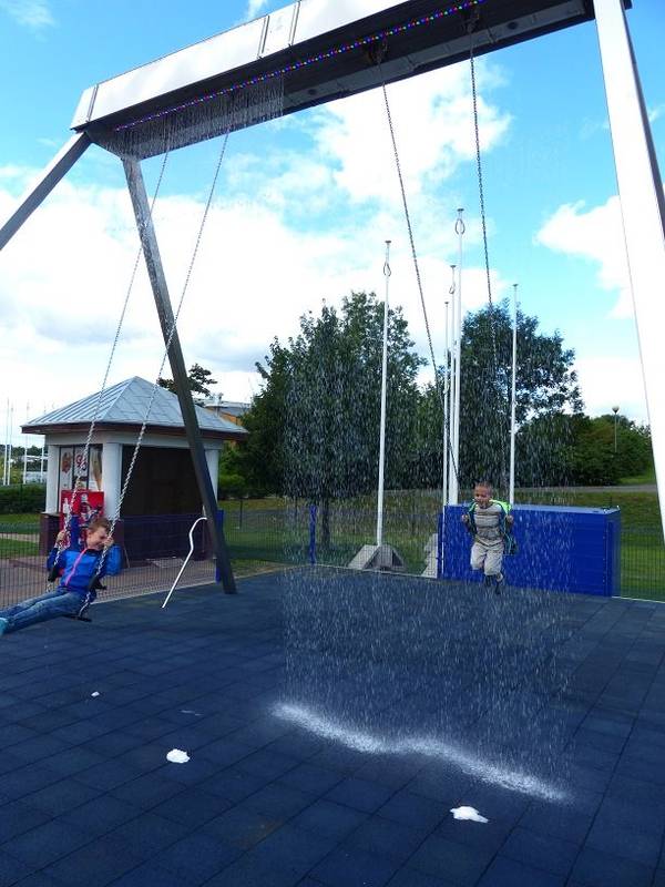Huśtać mogą się dwie osoby jednocześnie. Cała zabawa polega na tym, że huśtamy się bezpośrednio pod wodospadem wody, ale gdy się do niego zbliżamy, ściana wody znika.