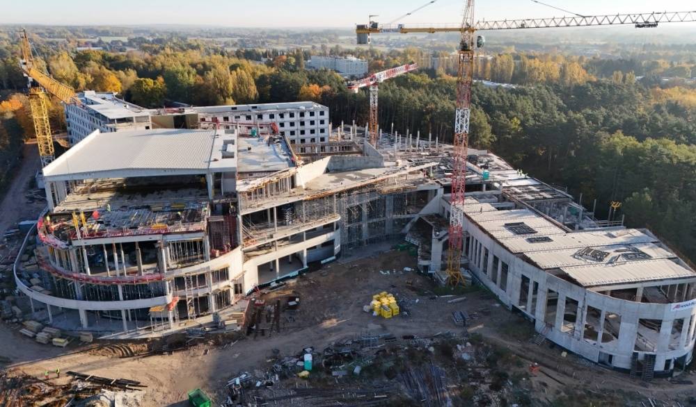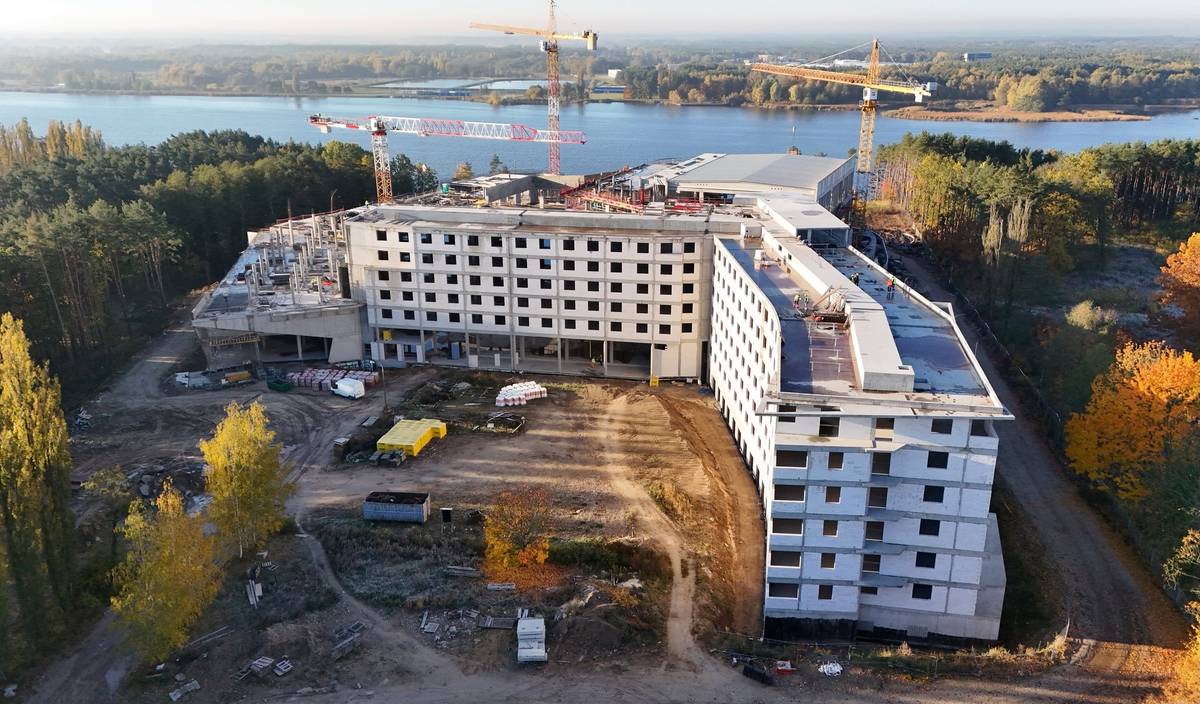 W strefie hotelowej zakończono już odbiory konstrukcji żelbetowych, a obecnie prowadzone są prace związane z wykonaniem izolacji termicznych i przeciwwodnych dachów. Ich ukończenie umożliwi rozpoczęcie kolejnych etapów robót wykończeniowych.
