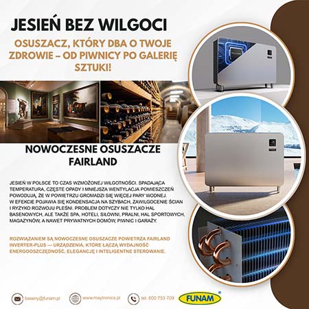 Podsumowując, nadmierna wilgotność powietrza w okresie jesienno-zimowym stanowi poważne zagrożenie dla zdrowia i stanu technicznego budynków. Nowoczesne osuszacze powietrza Fairland Inverter-Plus to skuteczne i energooszczędne rozwiązanie, które nie tylko chroni przed wilgocią i pleśnią, ale również idealnie wpisuje się w każde wnętrze dzięki swojemu wyglądowi. Dzięki nim zarówno przestrzenie publiczne, jak i prywatne domy czy mieszkania mogą pozostać suche, komfortowe i zdrowe, a użytkownicy – bezpieczni i spokojni o swoje otoczenie.
