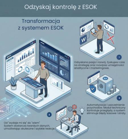 Spotykam wielu dyrektorów MOSiR-ów czy prezesów spółek i widzę u nich potworne zmęczenie materiału. To świetni fachowcy, ale zjada ich „bieżączka”. Próbują dopilnować wszystkiego osobiście i wpadają w pułapkę. To przestaje być zarządzanie, a bardziej przypomina walkę o przetrwanie w nieprzewidywalnych warunkach. Wdrożenie nowoczesnego ESOK, to chwila, w której wreszcie odzyskujesz kontrolę. A jak masz kontrolę, to wraca też chęć do działania.