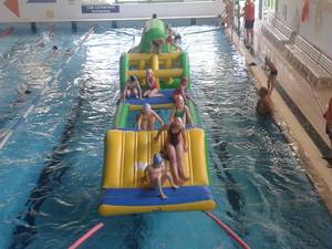 Kryta Pływalnia "Oceanik" w Tuszynie w dniu 14 maja br. obchodziła jubileusz 10-lecia. Z tej okazji przez cały tydzień w dniach 12-18 maja br. wynajęty został wodny tor przeszkód Aqua Track marki Wibit. Każdy kto odwiedził naszą pływalnię mógł sprawdzić swoje umiejętności na dmuchanym torze przeszkód. Zabawa na Aqua Track-u wliczona była w cenę biletu. Dodatkowo podczas obchodzonego jubileuszu z wykorzystaniem wodnego toru przeszkód zorganizowane zostały zawody dla naszych podopiecznych uczęszczających na zajęcia nauki i doskonalenia pływania.Zawody, które zorganizowaliśmy, jak widać po frekwencji, były trafione.