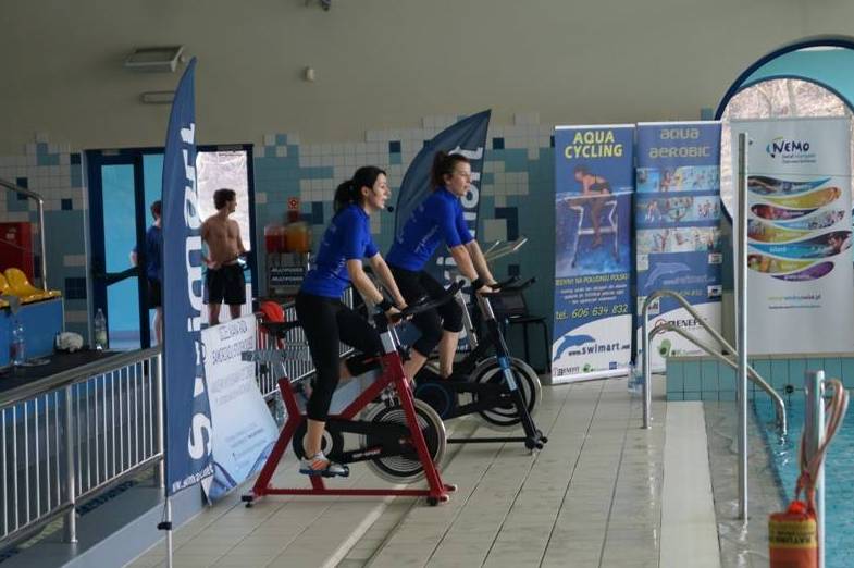 2) Zajęcia na rowerkach wodnych Aqua Cycling, od podstawowych ustawień po złożony cykl ćwiczeń.