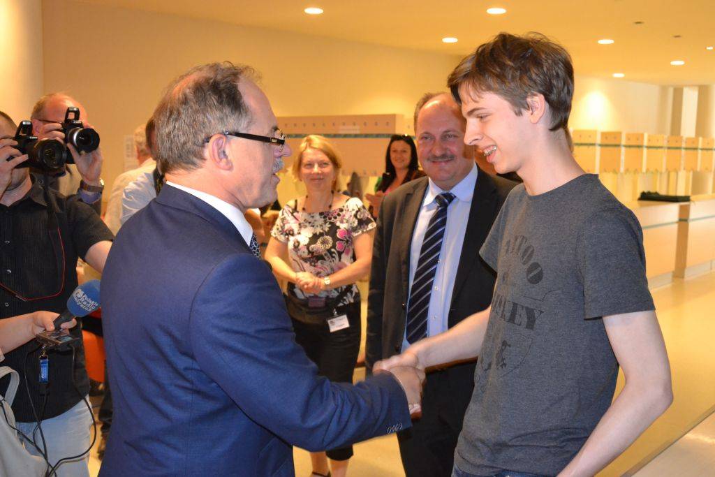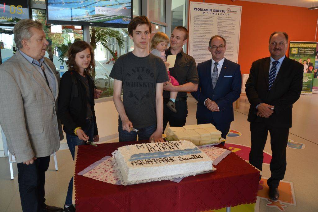 Czesław Renkiewicz, Prezydent Suwałk wspólnie z Waldemarem Borysewiczem, dyrektorem OSIR powitali w piątek 26 czerwca br. trzech wyjątkowych gości suwalskiego Aquaparku. Kamil Łapiński został milionowym klientem. Wcześniej Izabela Maczuga zdecydowała się jako 999 999 osoba odwiedzić suwalski obiekt. Pan Jakub Bałulis razem z córką otworzyli kolejny milion i został 1 000 001 klientem Aquaparku w Suwałkach. Wszyscy otrzymali karnety na 300 zł oraz prezenty. Na koniec był okolicznościowy tort.